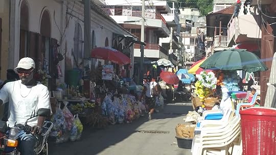 I'm home from visiting Haiti for the day job. Grueling trip. This photo sums up the trip. This is a public street in Cap Haitien, but vendors set up their wares on the street, spilling over past the sidewalk. It's so narrow and claustrophobic, and yet our truck navigated down this street. No choice. We drove down this street... and made it...with much patience, yelling in Creole and having the vendors move their wares.It was nerve wracking and exhausting, being in that kind of restrictive, tight space.