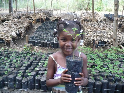 A little girl holding a sapling that is part of a reforestation project, a typical street scene in the city, a child in a warehouse that now serves as a school after the school was destroyed, and a peaceful farming scene in an area where we will be helping farmers with irrigation during the dry season.