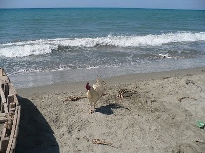 This is one of the more interesting sights I saw in Haiti last week. I've seen cocks in yards, cocks on the street, even saw a cock inside a tent, but never one on the beach.
