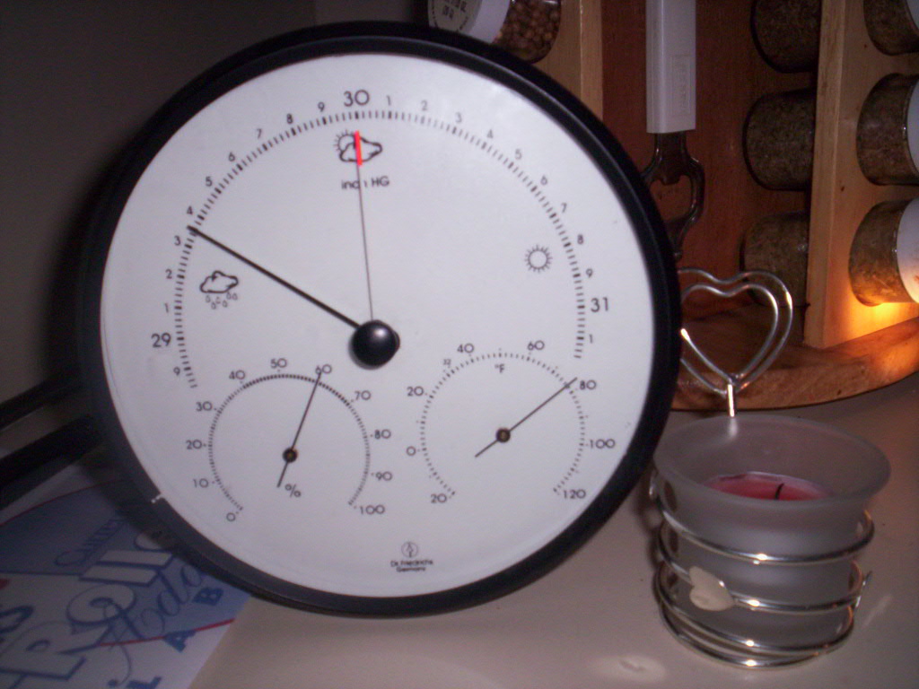 Such is life in S. Florida. We haven't had a hurricane since Wilma in 2006, and that one did a lot of damage. The storm dropped a tree on my house and we had to get a new roof, plus two other trees fell, but thankfully NOT on the house.On the right is the barometer reading at 7:25 a.m. the day Hurricane Wilma struck. You can see how low it is...and I will get out the trusty barometer again to see how low it gets with this storm. Hopefully it will not! The lower the pressure the more intense the storm.