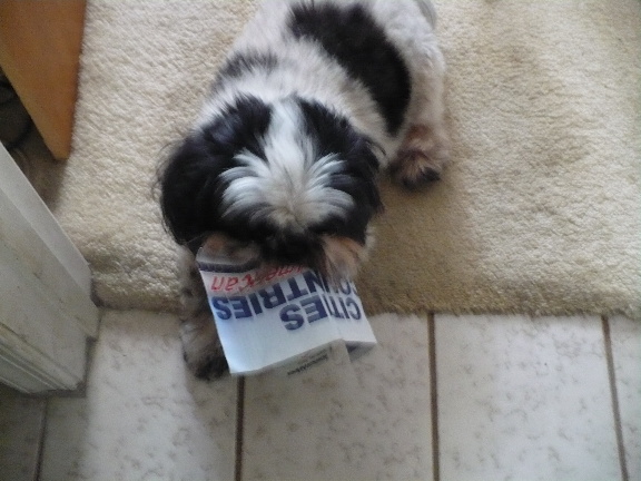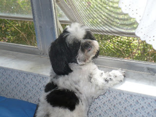 Dolce was the dog who always greeted us with a happy bark, and then ran to fetch a toy and bring it to us, his tail wagging furiously. Anything on the ground was game to Dolce. I traveled a lot for my day job to Haiti and other poor countries, and it was always tough leaving the DH and the dogs. They didn't like it, either. Once Dolce found my American Airlines ticket to Haiti and marched around with it in his mouth as if to say, "You're not going!"He was a wonderful dog who loved us, loved eating, loved looking out of the window and playing with his toys. He was well-trained, never had an accident and so laid back that when Cookie and Holly, our other two present rescues, would snip at each other for dominance, you could almost see him shrug. Like, "What's the problem, ladies?"