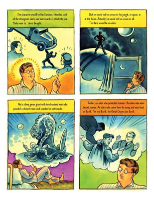 (The previous page teases that Jerry Siegel, Superman writer, was with his friends when at home rather than school; this page is the surprise reveal.)