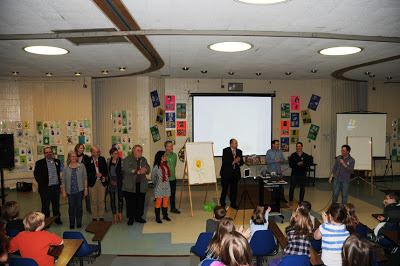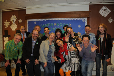 taking bows: Mike Rex, Susan Hood, Meghan McCarthy, Vincent X. Kirsch, Tracy Dockray, Bruce Degen, Katie Davis, Daniel Kirk, easel,Alan Katz, projector, Bob Shea, Tad Hills, me