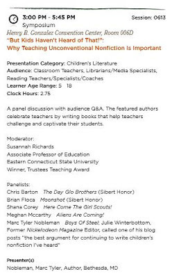 On 4/21/13, from 3 to 5:45 p.m. (yes, almost three hours!), at the International Reading Association Convention in San Antonio, we five authors, moderated by Susannah Richards, Associate Professor of Education at Eastern Connecticut State University, will panel-discuss the importance of unconventional nonfiction...the stories that are not yet widely known, the people who are not textbook names.