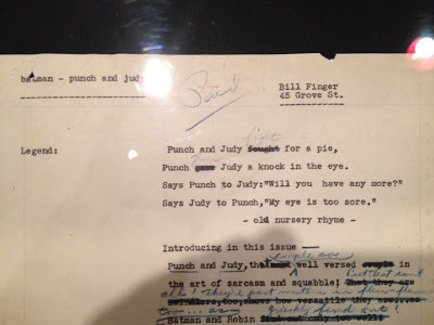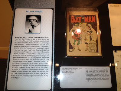 The museum hosted the traveling Jewish-creators-of-superheroes exhibit, which includes a Bill Finger script that Jerry Robinson donated. The bio on this placard gets a few details wrong (starting with the city in which Bill was born), but I am thrilled that such an exhibit exists: