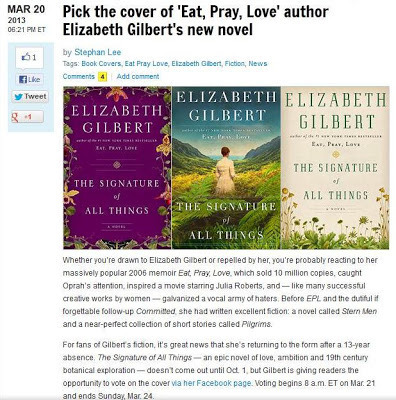 Best-selling author Elizabeth Gilbert took to the net to determine which of three covers would grace her latest, a novel called The Signature of All Things.