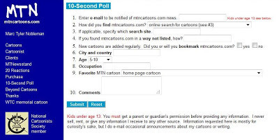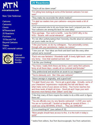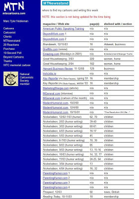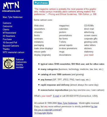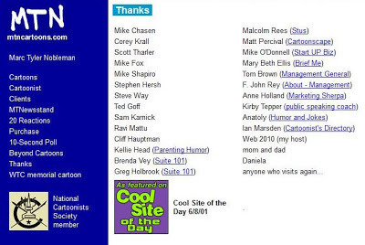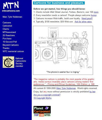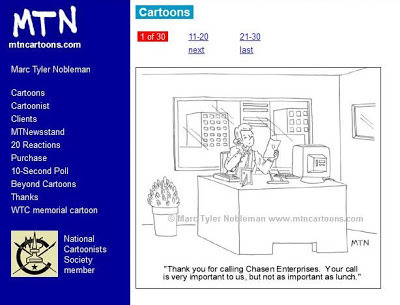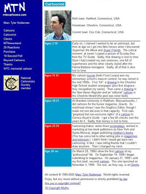 I remember being happy with the way I showcased my cartoons, though even then it was not the most functional approach. (Of the hundreds of cartoons I’d done, I included only 30, and there was no thumbnail gallery or “view by category.” You simply clicked from one to the random next, though I did think I presented a clever way to skip ahead—three choices of “1-10,” “11-20,” and “21-30.” Ah, simpler, un-savvy days.)
