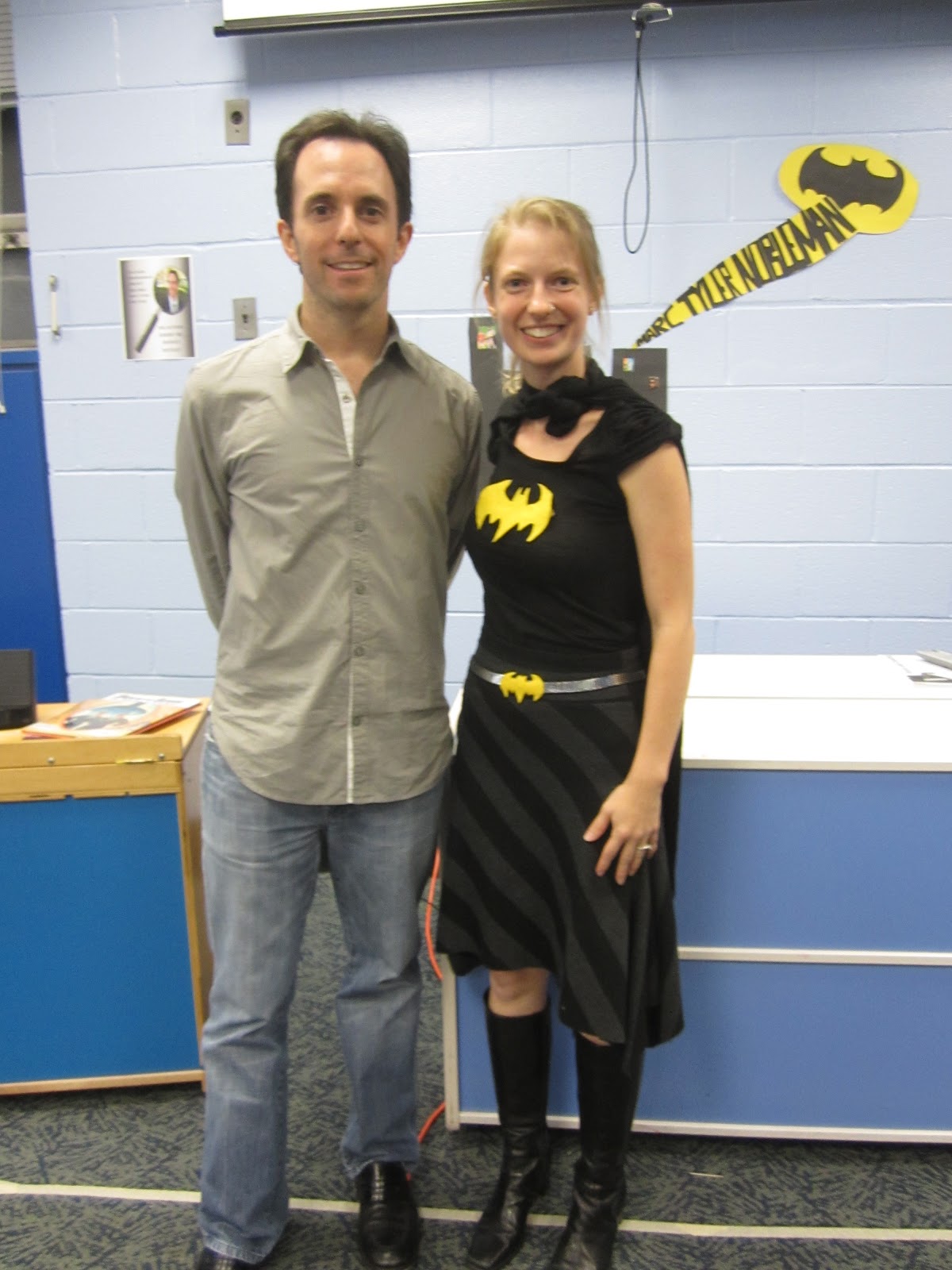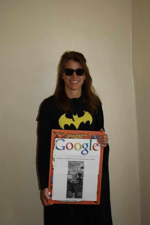 The first is Angela Smith, lower school librarian at Sidwell Friends School in Washington, DC. She didn’t need me to tell her who Batgirl really is, but I did suggest (when I spoke at Sidwell on 9/21/12) that she dress as Batgirl for Halloween. She was game: