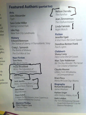 One bummer: Elizabeth and Chris, friends I’d made at the last two I attended, had to back out at the last minute. Since the club does not post participating authors online, about a week earlier, Elizabeth had e-mailed me a copy of the author lineup (with her mom’s must-sees circled).