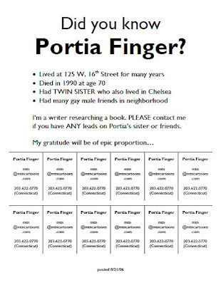 His first wife Portia died in 1990, so I felt I had a shot of finding friends of hers, many of whom were gay. There is a gay and lesbian center near where she was living when she died, so I made this flyer and posted it there: