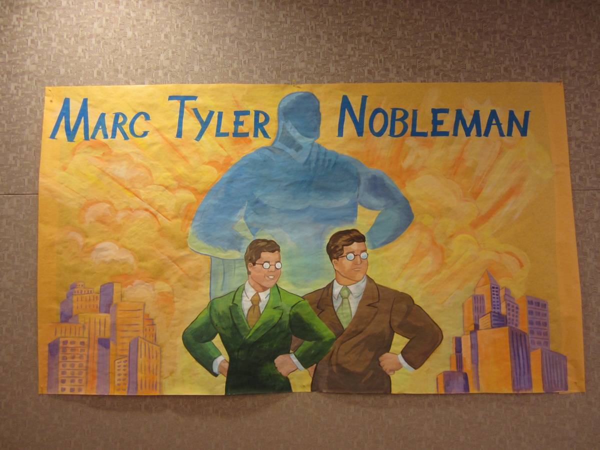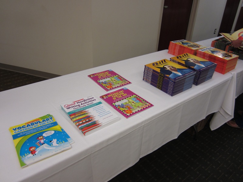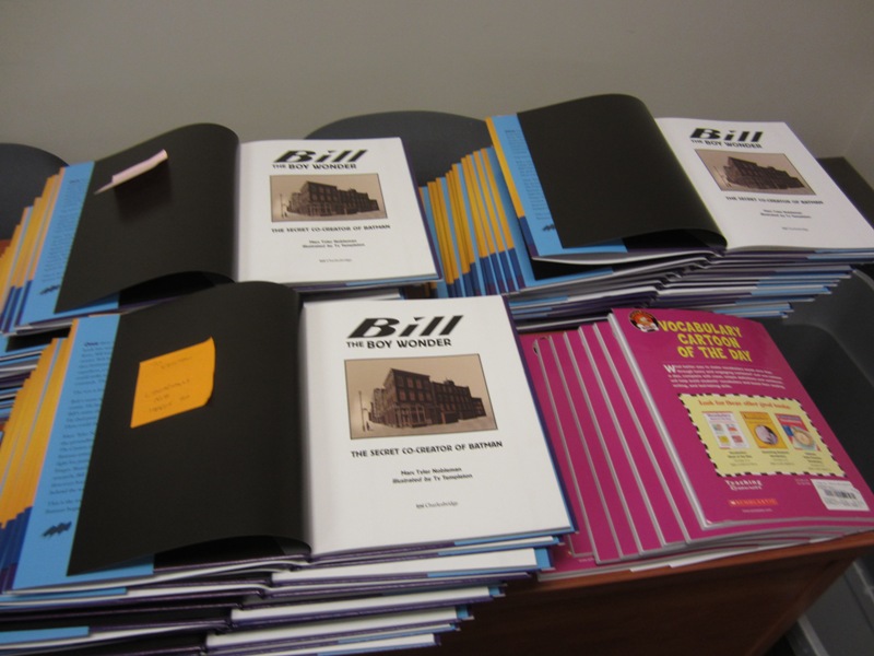 It was a stretch to tie my books Boys of Steel: The Creators of Superman and Bill the Boy Wonder: The Secret Co-Creator of Batman into the theme of “Books Boys Can’t Resist,” but I managed.Author presentation slots were staggered so only a couple of us were on site on any given day. Mine was 6/28/12 but the fun began the night before when I had dinner with a lively group including our kind host Karen Huff and an author I’ve corresponded with but not met before: the inexhaustible and inspiring Phil Bildner.