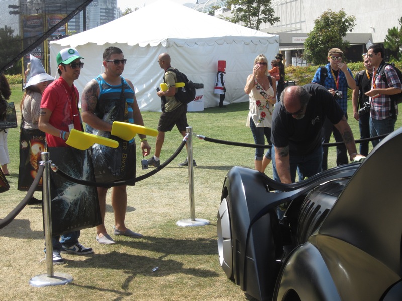 That afternoon, my lovely associates (sisters Christy and Molly) and I distributed the remaining Finger hands to fans gathered around the five Batmobiles parked outside. But not before posing ourselves: