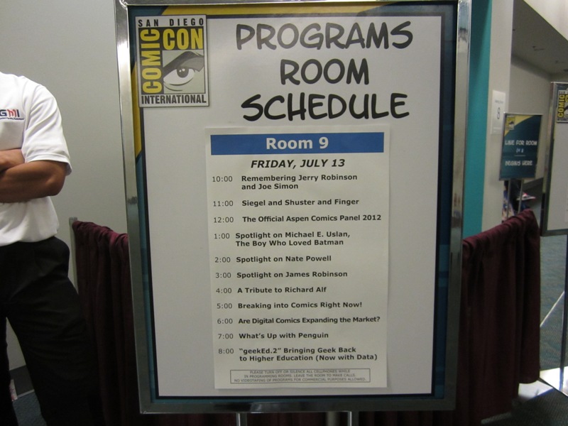 And though I worried when no line had formed outside the room before my first of two speaking appearances (“Batman’s Biggest Secret: The Bill Finger Story,” 7/12/12), a stampede of people soon showed up. I took these photos during my presentation (while they watched the trailer for my book Bill the Boy Wonder: The Secret Co-Creator of Batman):