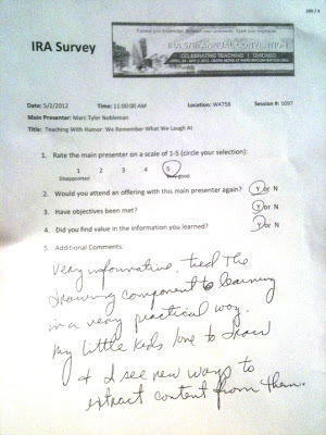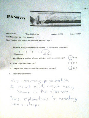 Last summer, I submitted two proposals for the 2012 IRA Convention. One was a lively panel of authors of picture book nonfiction called “But Kids Haven’t Heard of That: Why Teaching Unconventional Nonfiction Is Important.” The other was a variation on a popular workshop I give nationwide. It’s normally “The Language of Cartoons”; I renamed this version “Teaching with Humor.”