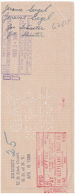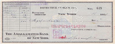 This March 1, 1938 Detective Comics check, signed by Jack Liebowitz, is made payable to Jerome Seigel and Joe Schuster. (You would think that DC would have spelled Siegel and Shuster's name correctly for a character as important as Superman!) The check, in the amount of $412, includes an account of items being paid for. At the very top is "Superman $130."