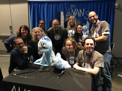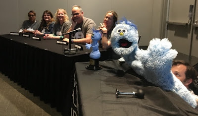 On 4/15, strong winds stranded a number of guests in their respective airports/hometowns, one of whom was my pal Tom Angleberger. At 8:45 pm, I was recruited to pinch hit for Tom in an author vs. author game show starting at 9 p.m. hosted by a puppet. (You read that right. Again, this conference is legendary.)