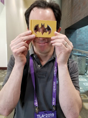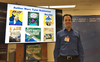 On 4/17 at 8:30 am (which seemed early to me but doesn’t faze librarians), I gave the first of my two featured talks, this one on Bill Finger. My second was scheduled for the next day, at 10:30 am, which was close to the end of the conference (and after the exhibit hall would be closed), so I feared few would show up. However, I had at least double the audience for a talk on Thirty Minutes Over Oregon; my angle to discuss the book was empathy, and that also described the crowd. They were very kind to me and my story.