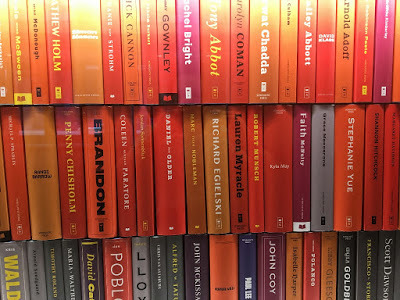 Weirdly, however, I saw my name on at least three spines. This is definitely an oversight, a glitch in the system; I noticed only one or two others who also appear more than once. Also weirdly: all three of my books are in the same row.