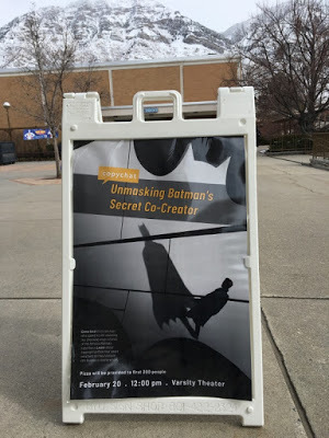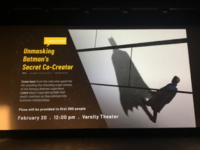 I was invited by the Copyright Licensing Office. The topic was Bill Finger framed through the lens of copyright. The talk was open to anyone on campus. The turnout exceeded my expectations—surely in part due to the extensive marketing (which included free pizza).