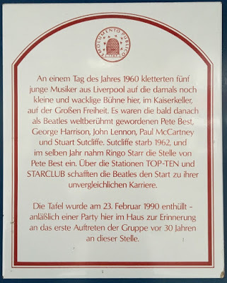 I've been a Beatles fan since high school and I've come to Hamburg at least olnce most years since 1998, but it was not until this year when I cobbled together a tour of the Beatles sites of Hamburg (similar to what I did with another '60s watershed, the Vietnam War, in Ho Chi Minh City). As far as I know, and oddly, no guided tour exists; if it did, it would be a walking tour, and it would be short but fascinating.