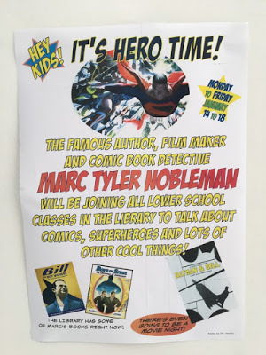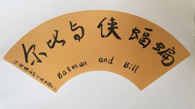 The school screened Batman & Bill on Wednesday afternoon for grades 4-8 and their families. Mike came with his parents, who spoke little English. His mom had made me a modest yet lovely banner. I'm told it says "Batman (Bianfu Xia) and Bill (Bi er)" in modern Chinese script (simplified characters). The vertical column on the left is the artist's name and the date, followed by her chop in red.