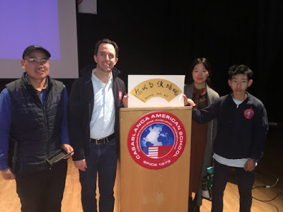 One student who was especially taken by my presentations was a middle schooler whose family had moved to Morocco from China a year earlier; he took the name Mike. He came with no English. Not only did Mike now speak English fairly well, he was not remotely shy. During his writing workshop, he took notes in both English and Chinese, asked questions, and came up to me after to ask for a signature; he also said he wanted to have a conversation with me the next day.
