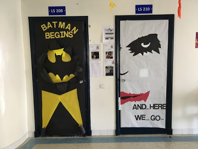 The lower school had a "design your classroom door" contest and despite my lack of training in that regard, I was honored to be named one of the judges. Two groups won first place (one for each floor of the lower school) and both reacted so cutely. Upon hearing her class won, one kindergartner shouted "I'm telling my mom!"