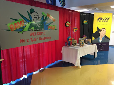 Day 1. Webb School greeted me with an elaborate and colorful set on which to perform. They also loaded me up with a generous superhero-themed gift bag. (We had to start later than planned because a fierce storm swept through late the night before, felling many trees, which forced school to open on a delay.)