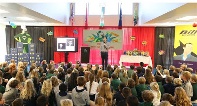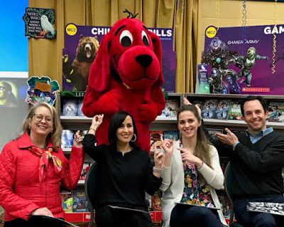 In this program, Scholastic (specifically the Book Fair division) generously arranges a group of authors (in my experience, four at a time) to visit two schools in one day. These are schools that serve a low-income population. Scholastic not only covers all expenses (including a nice dinner) for the authors but also donates one copy of one of each visiting author's books and three other books to every student who hears him/her speak!