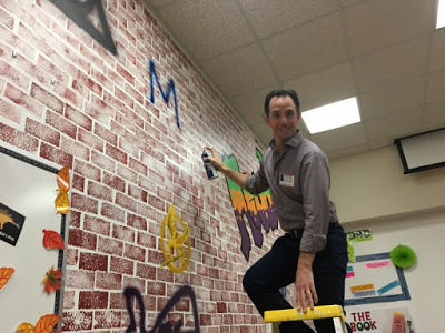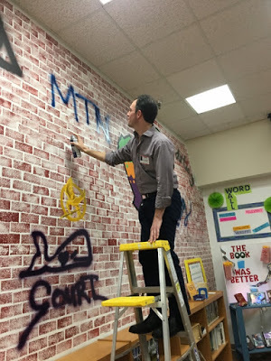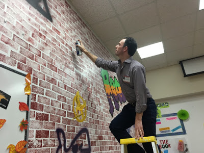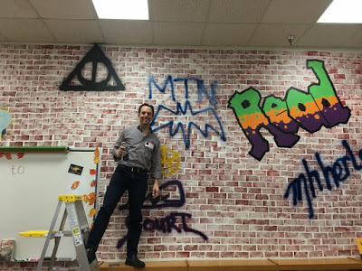 Day 2. One of the two schools, Norris Middle School, asked me to tag their author graffiti wall. It was my honor...and my first time with a spray can, hard as that may be to believe, given the edgy persona I sport.
