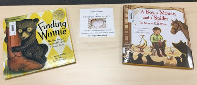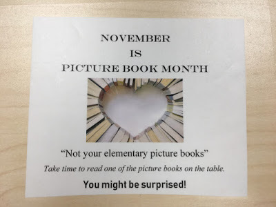 At Jefferson Middle School, library tables are strewn with picture books and an invitation/challenge to students to pick one up despite the perception by some that picture books are only for elementary kids.