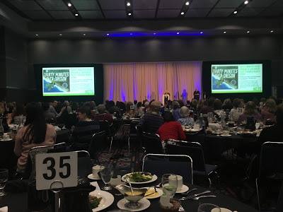 Lisa DiSarro, Houghton Mifflin Harcourt's Director of School and Library Marketing, kindly accompanied me to the 11/17/18 luncheon where the two 2018 Orbis Pictus winners spoke and the new class was announced. HMH had invited me to attend the luncheon before they knew that Thirty Minutes Over Oregon would be among the honored there. They did find out a day beforehand, but chose not to tell me—which I so appreciated. It was so memorable to be surprised by the announcement made to the room of 35+ tables of 10 people apiece, including many author friends (some of whom were similarly honored, though many of the honorees were not there).