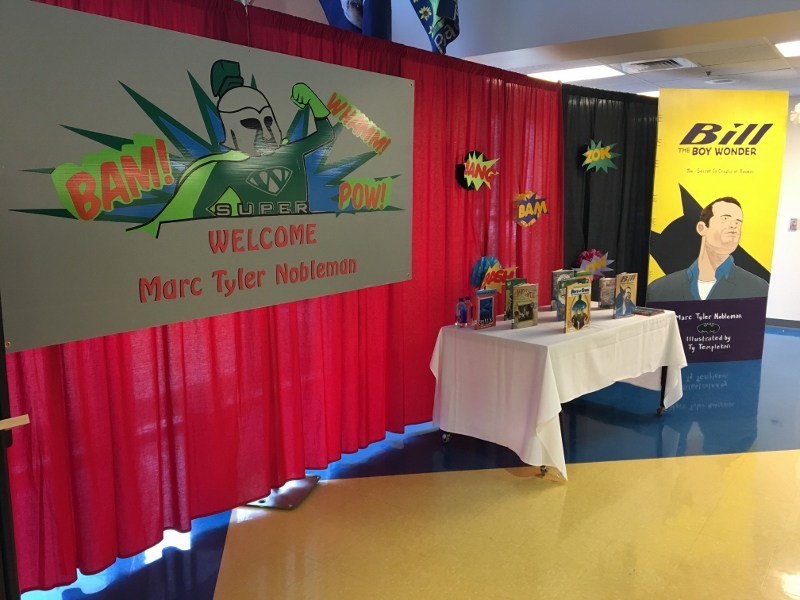 Day 1. Webb School greeted me with an elaborate and colorful set on which to perform. They also loaded me up with a generous superhero-themed gift bag. (We had to start later than planned because a fierce storm swept through late the night before, felling many trees, which forced school to open on a delay.)
