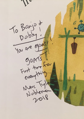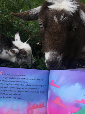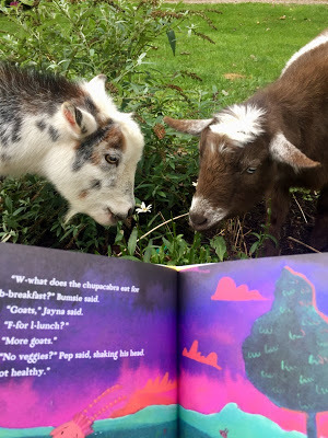 A highlight among highlights(and a first for me):signing a copy of one of my books (The Chupacabra Ate the Candelabra, which co-stars three goats)to two goats.