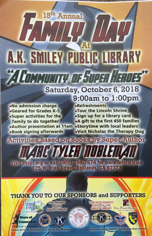 Family Day is a free annual event open to the public held at the Smiley Public Library in Redlands, CA. It offers a selection of stations based on the books of a single author, and this year (10/6/18), that author was me.