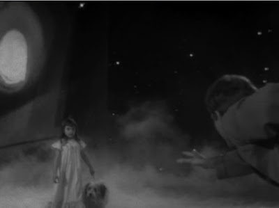 They filled the stage with fog or dry ice and filmed it by pointing the camera into a reflecting ball in which my character was reflected, thereby making me look like I was floating and sometimes upside down. They wired the dog to my nightgown so that it looked like it was "leading" me out of the 4th dimension.