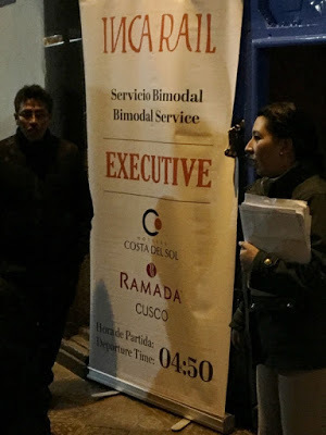 3:30 am—alarm went off after an altitude-impacted night of half-sleep: dry mouth, cold-like congestion, mildly feverish; all that remained as I set out was head pressure (not quite a headache)4 am—picked up at hotel by rep from the travel agency, but he did not have one key item he was supposed to: my train ticket (note: when I entered the dimly lit hotel lobby, two hotel staff member who were sleeping on the vinyl couches awoke with a start); though I was not told why, I was driven to another hotel where lots of people were waiting and where, after at least 20 minutes of bumbling, the travel agency rep managed to produce the train ticket 4:50 am—private bus with about 20 others to Ollantaytambo; sure enough, as our altitude decreased, my head pressure dissipated 7:20 am—Inca Rail to Aguas Calientes9 am—arrived at Aguas Calientes; I felt like I'd already traveled a full day and it was only the start of work according to the traditional schedule 10 am—after tooling around the tiny town (which is mostly tourist restaurants selling pizza but also has several discos and even a soccer field), I took the bus to Machu Picchu11 am—met my guide Anibal and entered Machu Picchu; his best line of the day: "Welcome to my office" (perhaps you've had a tour guide somewhere who's said the same)12:50 pm—after exploring from one end to another, we began to hike the portion of the Inca Trail that leads to the Sun Gate; I'd been told it would take 45 minutes one way so we hauled (because I could not miss my train back) and made it in 252 pm—after hiking back down, we left Machu Picchu4:12 pm—train back to bus back to Cusco8:30 pm—I arrived in Cusco, but to the departure hotel from that morning; apparently the travel agency forgot to provide a ride for that last step (10 minute drive to my hotel); luckily, other travel agency people who were there (I don't know exactly who they were) kindly drove me