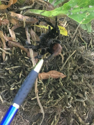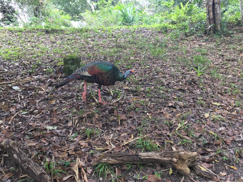 Animals spotted: howler and spider monkeys, an exotic-looking male turkey (see below), lots of birds (in trees), armies of marching ants, a couple of coatis (similar to raccoons), and, most jungly, a tarantula.