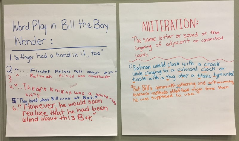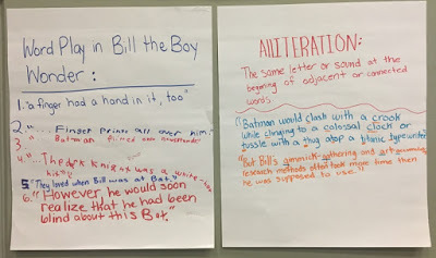 Inspired by Bill Finger, I used "bill," "finger," and "bat" puns throughout Bill the Boy Wonder: The Secret Co-Creator of Batman, and the kids discussed this (and alliteration):