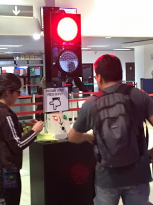 Before exiting the Guatemala City airport, everyone has to push a button on a small console that looks like a prop from a Cold War doomsday movie. It's attached to a stoplight without the yellow. If the green lights up, you proceed out. If red, you've been arbitrarily selected for inspection. I got green. This guy didn't.