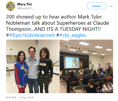 Thank you again to Marjorie Arnett, my author "angel" Andy Mitchell, and all the committee members/volunteers who made the festival (and my participation in it) possible. It was an honor to meet James and Lesa Cline-Ransome, whose joint presentation was disarming, modest, and impressive. It was a similar honor to meet Kathi Appelt (and her husband) in person years after I "met" her as both a participant in the "kidlit authors read bad reviews" videos and a keynoter at a particularly dramatic SCBWI conference.