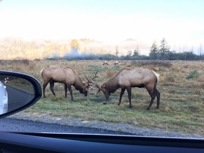 Combative elk. Dozens more elk were in the vicinity, undisturbed by the cars driving through their territory.