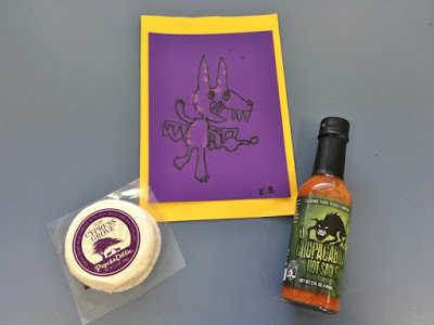 The students and staff at Blue Lake gave mechupacabra hot sauce, goat cheese (inside joke if you've read the book), and an adorable card/drawing.