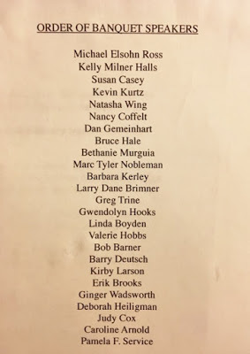 This festival has been running every other year since the 1970s and lasts three days. The first two days are the school visits, the third day is a four-hour group book signing at the public library. The first night (Wednesday) was a cocktail mixer, the second night was a potluck dinner where a group of students from a performing arts high school acted out a book from three of the authors (including, to my great honor, The Chupacabra Ate the Candelabra; the main one was Kirby Larson's Hattie Big Sky), and the final night was a ticketed banquet where all 25 authors spoke—three minutes apiece, (semi-)strongly enforced. I was impressed with how polished most of the semi-extemporaneous mini-speeches were—lots of these folks have slick comic timing.