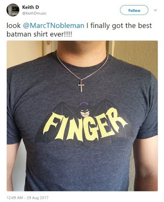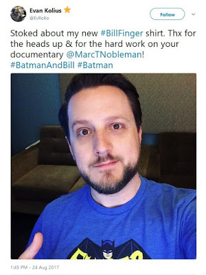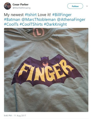 In the final scene of the documentary Batman & Bill, I am wearing a Bill Finger T-shirt. (I have also forced a shirt on each member of my family.) Since the film premiered in May 2017, I have been tweeting where to get one for yourself. Some have, and tweeted a photo of it.