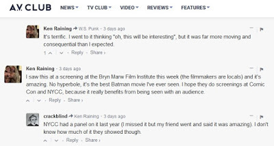 "...incredibly heartbreaking … remains consistently thrilling all the way through … relentlessly entertaining, informative, heartbreaking, and heartwarming story … by the end of it, I was in tears, and as an enormous fan of Batman and his world, that's the greatest compliment I can offer this documentary."
