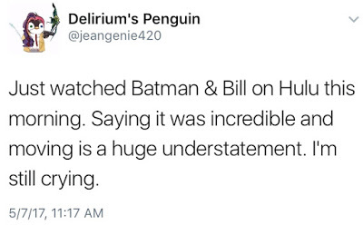 "While the entire film is fascinating, it's in this back half that it becomes truly emotional …as the closing minutes…unfold, many viewers will likely be ready to storm the offices of DC Comics themselves and demand justice. … Batman & Bill has the same qualities as many of the best Batman tales over the years. It's got secret identities, mysteries, injustices demanding to be brought into the light, and even a conniving villain determined to steamroll the meek for his own personal gain. … a must-watch for comics fans and a gripping real-life story even for those who couldn't tell Dick Grayson from Dick Clark."