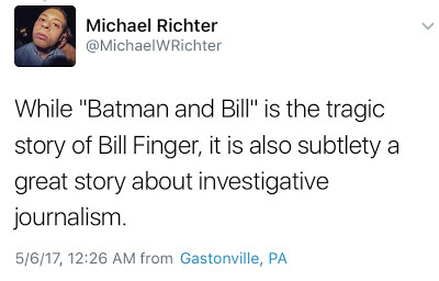 "While I am a lifelong Batman fan, this story is compelling for non-fans as well. The combination of history and mystery surrounding one of the biggest pop culture icons ever makes it positively addicting. And the tragedy of Bill Finger's place as a lost figure in the real life history of Batman is as compelling as any superhero storyline could ever be largely because like those stories, this is also a quest for justice and standing up for the powerless.