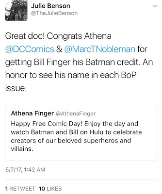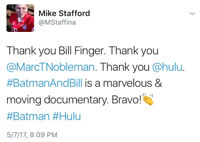 The documentary Batman & Bill, about the fight to get Bill Finger credited on Batman, is premiering on Hulu on May 6. It is the first-ever film based on a nonfiction book for young readers. Thank you again to all who agreed to appear in the film.
