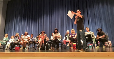 view from the stage: Aaron, S.J., Lynda Mullaly Hunt (peeking out from back), Jackson, Aisha Saeed (with microphone), Erica Perl (patterned dress),Paul Griffin